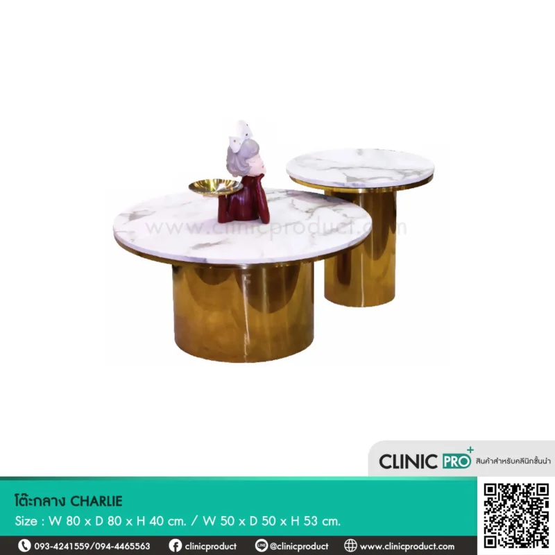 โต๊ะกลาง CHARLIE ออกแบบมาเพื่อเพิ่มความโดดเด่นให้พื้นที่คลินิกของคุณ ด้วยพื้นผิวลายหินอ่อนสุดหรูและโครงขาชุบสีทองที่สวยงาม โดดเด่นทั้งในเรื่องของดีไซน์และการใช้งาน