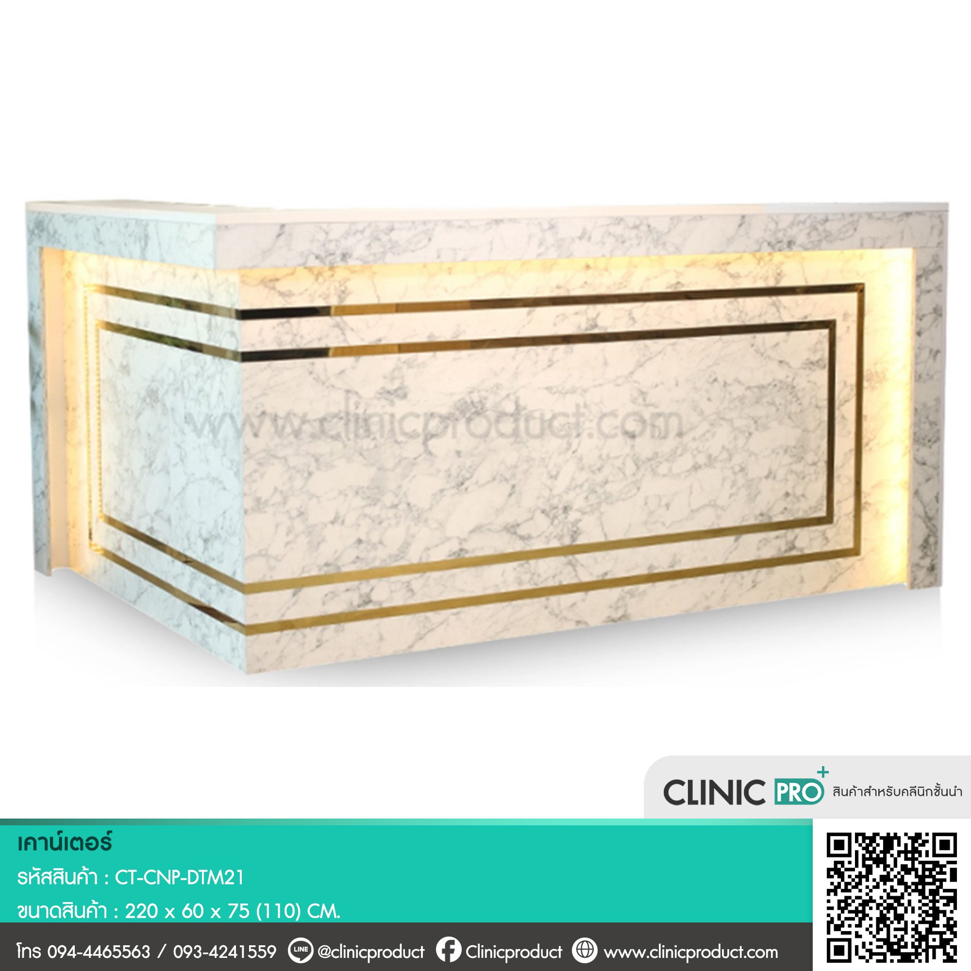 เคาน์เตอร์ลายหินอ่อน DTM21  คือคำตอบของการตกแต่งพื้นที่ต้อนรับให้ดูหรูหราและมืออาชีพ ออกแบบด้วยลายหินอ่อนที่สวยสะดุดตา ตัดกรอบทองรอบด้านเสริมด้วยแสง LED สีทองให้มิติสว่างหรู ดูทันสมัย มีระดับ โดดเด่นในทุกมุมมอง เหมาะกับคลินิกเสริมความงาม สปา โรงแรม หรือสำนักงานระดับพรีเมียมที่ต้องการภาพลักษณ์หรู สง่างาม และน่าเชื่อถือ
