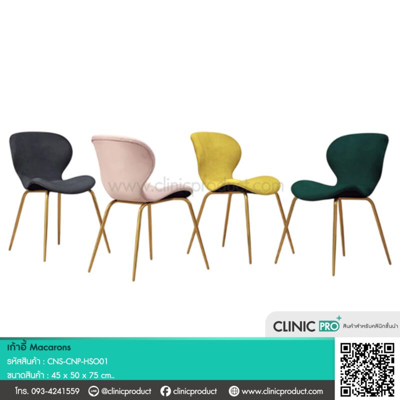 เก้าอี้ดีไซน์แบบ Macarons ที่ให้ความรู้สึกเรียบหรูและทันสมัย โครงสร้างหลักโดดเด่นด้วยเบาะที่มีรูปทรงโค้งมน สะท้อนถึงแรงบันดาลใจจากขนม Macarons ที่นุ่มนวลและสวยงาม